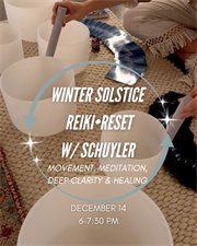 Join us for an evening of movement, meditation, Reiki, oracle card guidance, and sound healing — a seasonal ritual designed to help you release the old and step into deep clarity for the months ahead. As the Winter Solstice invites stillness and reflection, Schuyler guides you through practices that unwind the nervous system, open energetic pathways, and reconnect you with your inner wisdom.